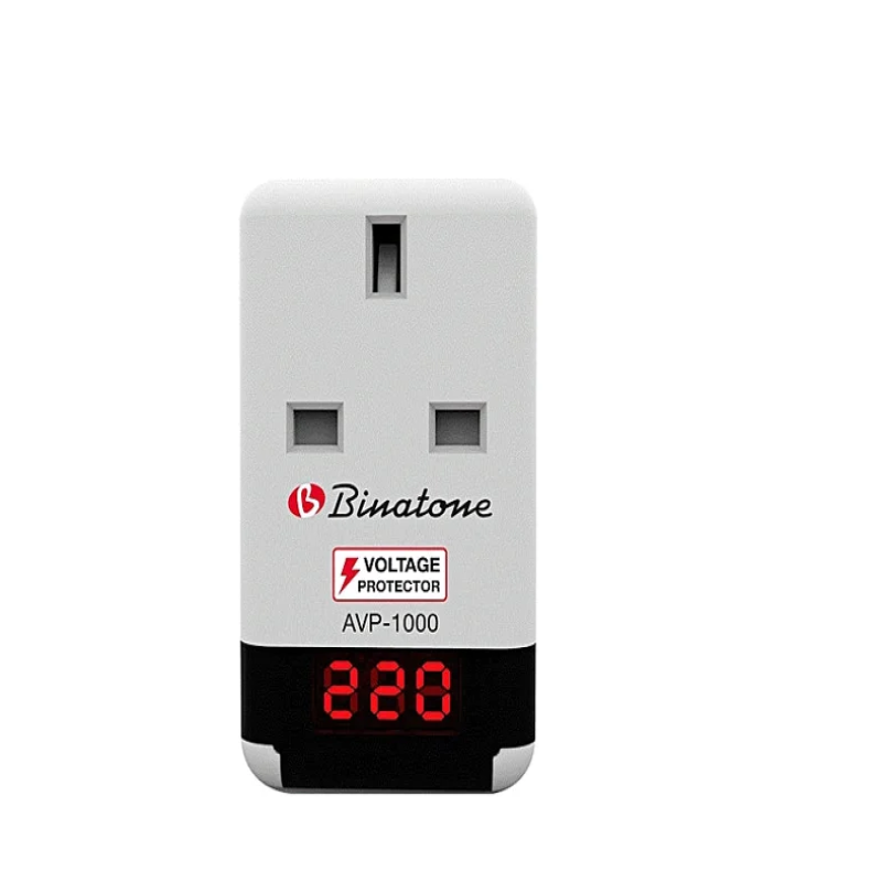 The Binatone AVP1300 Auto Voltage Protector safeguards electrical appliances by automatically disconnecting power during unsafe voltage conditions and reconnecting when it stabilizes, preventing damage from high or low voltage. It features fast response detection, thermal overload protection, and efficient surge suppression to shield TVs, refrigerators, audio systems, computers, and other home electronics. Designed for easy plug‑in use with LED status indicators, this protector ensures reliable performance and extended equipment lifespan.