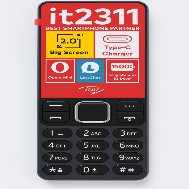 The Itel IT2311 is a feature phone that supports dual SIM operation on 2G GSM networks. It has a 2.4 inch TFT display, a large capacity battery for extended use, wireless FM radio, a rear camera, expandable memory, USB charging, and a built-in torchlight for everyday communication.