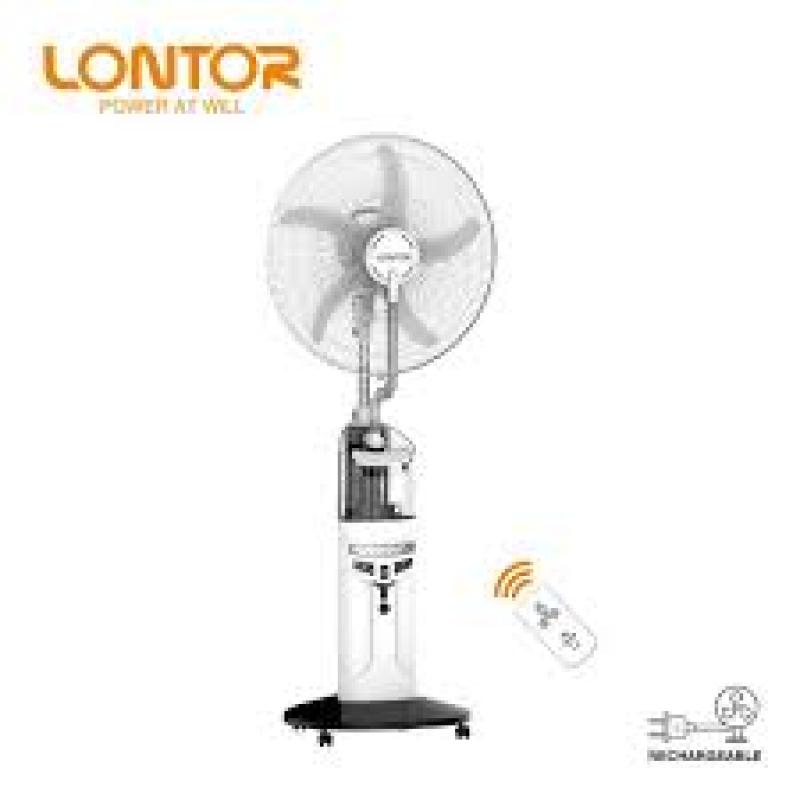 The LONTOR CTL-CF046R-18 is an 18-inch rechargeable water mist fan designed for enhanced cooling performance in homes and offices. It combines strong airflow with an integrated mist function to improve air circulation and comfort. The built-in rechargeable battery supports use during power outages, while the remote control allows convenient operation from a distance. It also features a USB port for charging compatible devices. With multiple speed settings, wide-angle oscillation, and AC/battery operation, this fan is suitable for reliable indoor cooling.