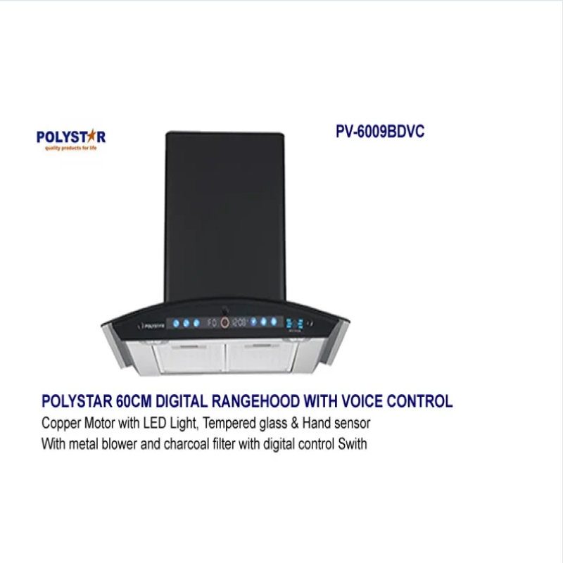 The Polystar PV-6009BDVC features a 60cm wide extraction system designed to fit standard cooktops. It integrates voice control technology for hands-free operation during cooking. The digital control panel enables precise and responsive command selection. A durable copper motor delivers strong and consistent suction performance. The tempered glass finish enhances durability and modern kitchen aesthetics. Built-in hand sensor activation allows touchless control. The charcoal filter effectively removes smoke, grease, and cooking odors. Energy-efficient LED lighting improves visibility over the cooking area. The wall-mount chimney design supports structured and space-saving installation. The advanced filtration system ensures cleaner kitchen air during intensive cooking sessions.