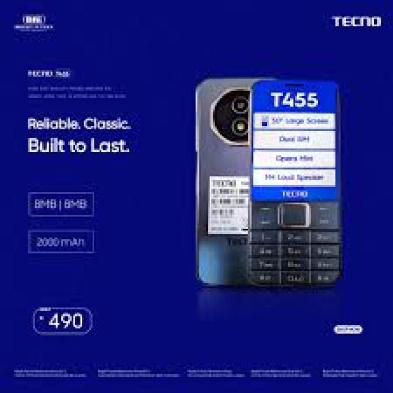The Tecno T455 is a durable feature phone designed for reliable daily communication. It supports dual SIM usage, offers long battery life, clear display visibility, and simple keypad operation for calls, SMS, and basic multimedia functions.