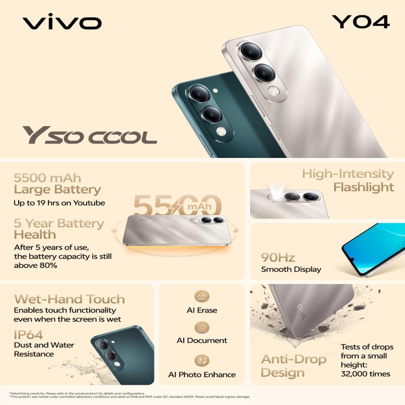 The Vivo Y04 64/4GB features a large 6.5-inch HD+ display for clear everyday viewing, powered by an efficient processor with 4GB RAM and 64GB internal storage, includes a dual rear camera system for basic photography, supports expandable storage via microSD, runs on Android with Vivo’s user interface, and delivers reliable all-day power with a 5000mAh battery.