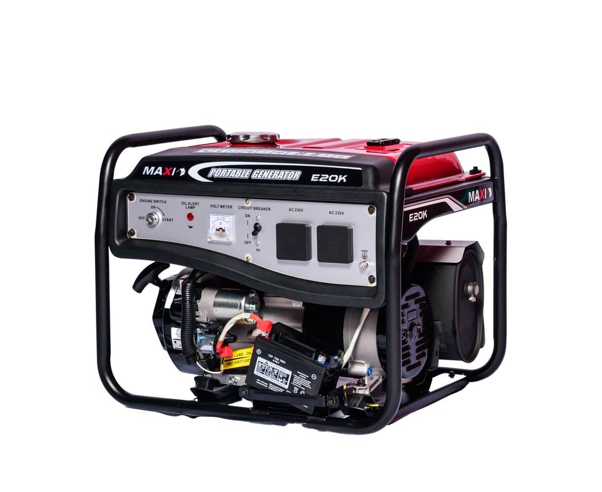 The Maxi 2kw / 2.5KVA Generator MAXIGEN EK20 is a reliable, gasoline-powered generator that offers stable power for home, office, and small business use. With a 2.0KW power output and a 2.5KVA capacity, this generator is designed to handle essential appliances and devices efficiently. It features a compact and portable design, making it ideal for those who need flexible and affordable power solutions. The MAXIGEN EK20 is built with durability in mind, providing extended runtime with its fuel-efficient engine, and is equipped with automatic voltage regulation for stable performance.