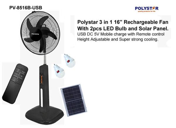 - Model: Polystar 16" 3-in-1 Rechargeable Standing Fan – PVKL-8516USB