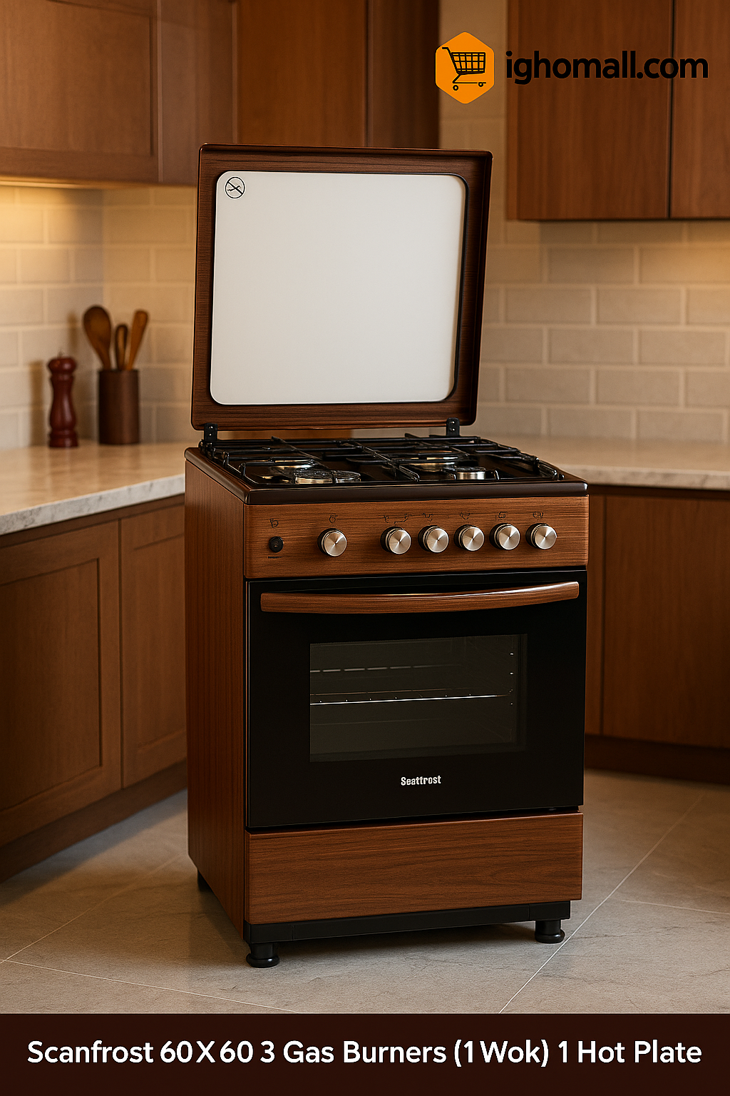 The Scanfrost 60x60 3 Gas Burners with 1 Wok Burner and 1 Hot Plate merges functionality with a stylish wood finish, making it an excellent choice for modern kitchens. It provides a versatile cooking experience while adding a touch of elegance to your culinary space.