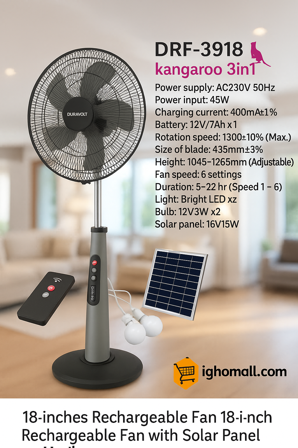 Stay cool and enjoy bright lighting with the Duravolt 3-in-1 18 Inches Rechargeable Fan with Solar Panel & 2 LED Bulbs. Perfect for Nigerian homes — no more NEPA wahala! Shop original Duravolt fans online now at Ighomall.com.