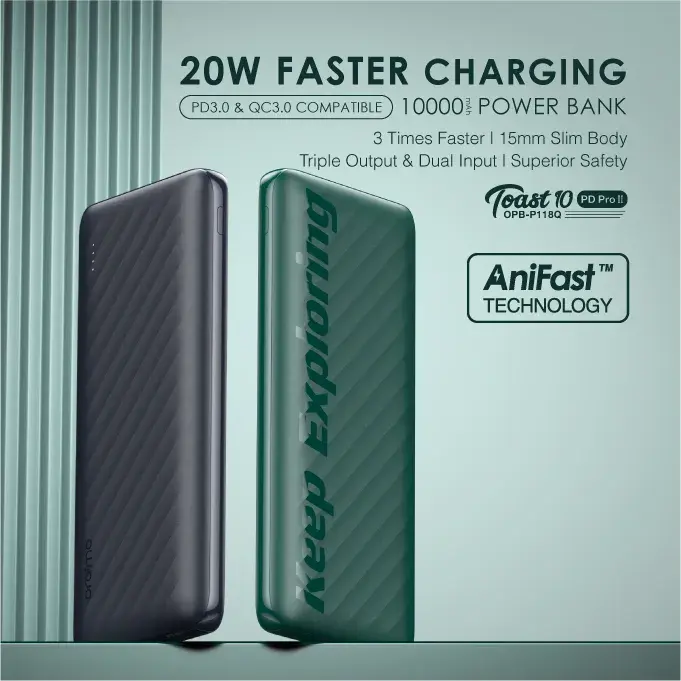 The Oraimo OPB-P118Q Toast 10 Flash II is a high-capacity power bank designed to keep your devices charged on the go. With a 10,000mAh capacity, it offers both Type-C and Micro-USB inputs for versatile recharging options. The power bank features triple output ports, including a PD 3.0 Type-C port and two QC 3.0 USB-A ports, allowing you to charge multiple devices simultaneously. Its slim design ensures portability, making it easy to carry in your bag or pocket.