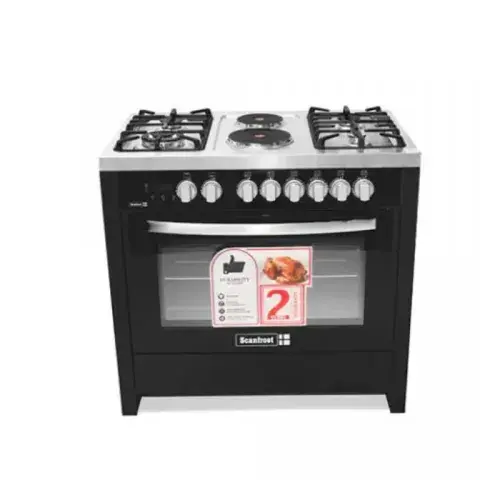 The Scanfrost 90x60 4 Gas Burners, 2 Hotplates with Gas Oven, Gas Grill, and Full Auto Ignition in stainless steel is a versatile cooking appliance that seamlessly combines functionality with modern design. Featuring multiple cooking options, it caters to diverse culinary needs.