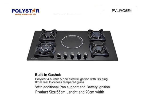 Product Title: POLYSTAR 4 Gas + 1 Electric Tempered Glass Built-In Gas Hub (Model: PV-JYG5E1)
